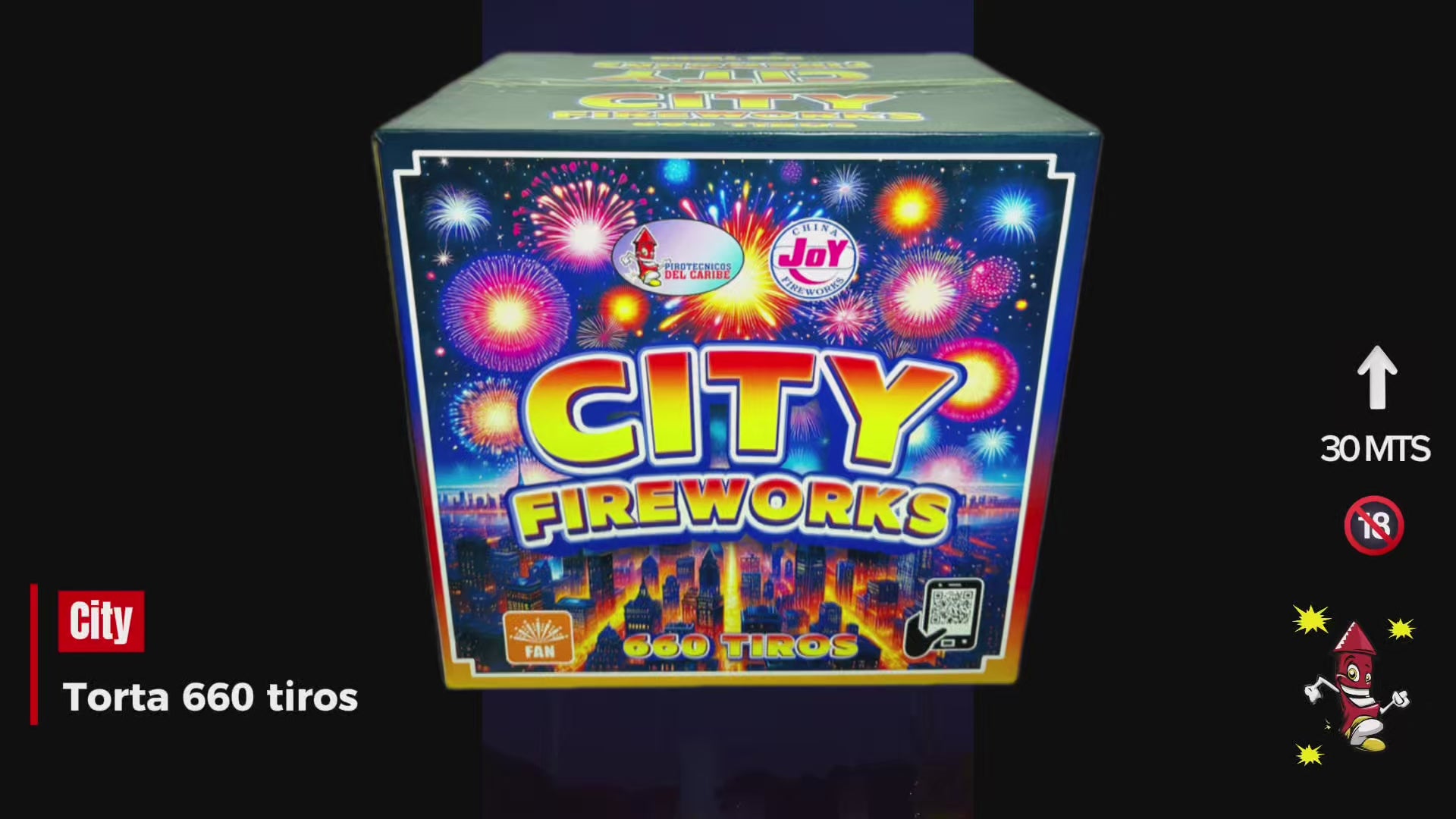 La City Fireworks 660 Tiros es la versión compacta de la línea City, diseñada para ofrecer un espectáculo intenso, rápido y continuo en un tamaño más manejable. Con 660 disparos, esta torta entrega una ráfaga sostenida de chispa, destellos y sonido tipo “metralleta pirotécnica”, ideal para animar eventos nocturnos sin necesidad de un montaje grande.